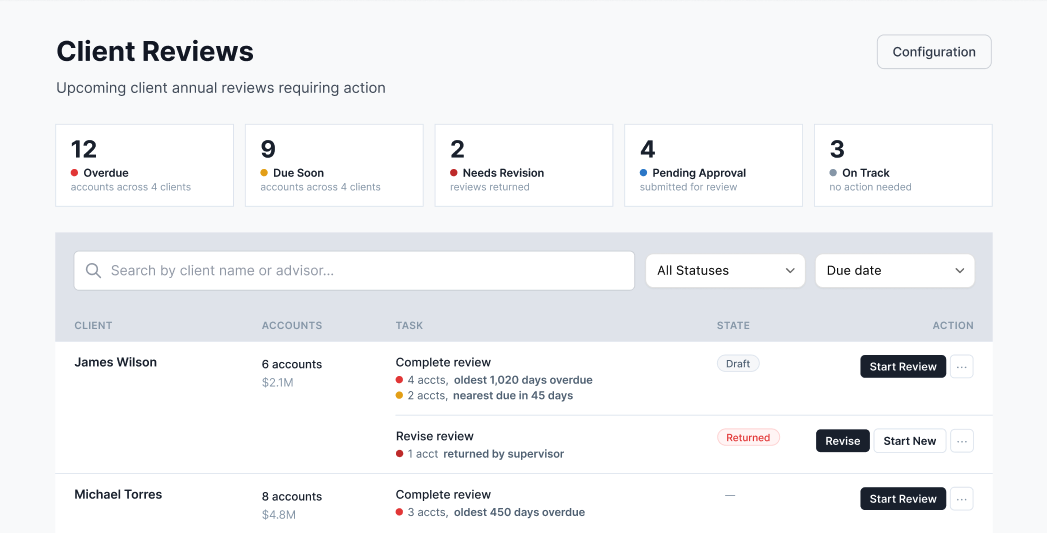 - The dashboard surfaces what matters. The advisor logs in and sees a prioritized list, overdue reviews at the top, upcoming ones next. Quick filters let them zero in on what needs attention this week.